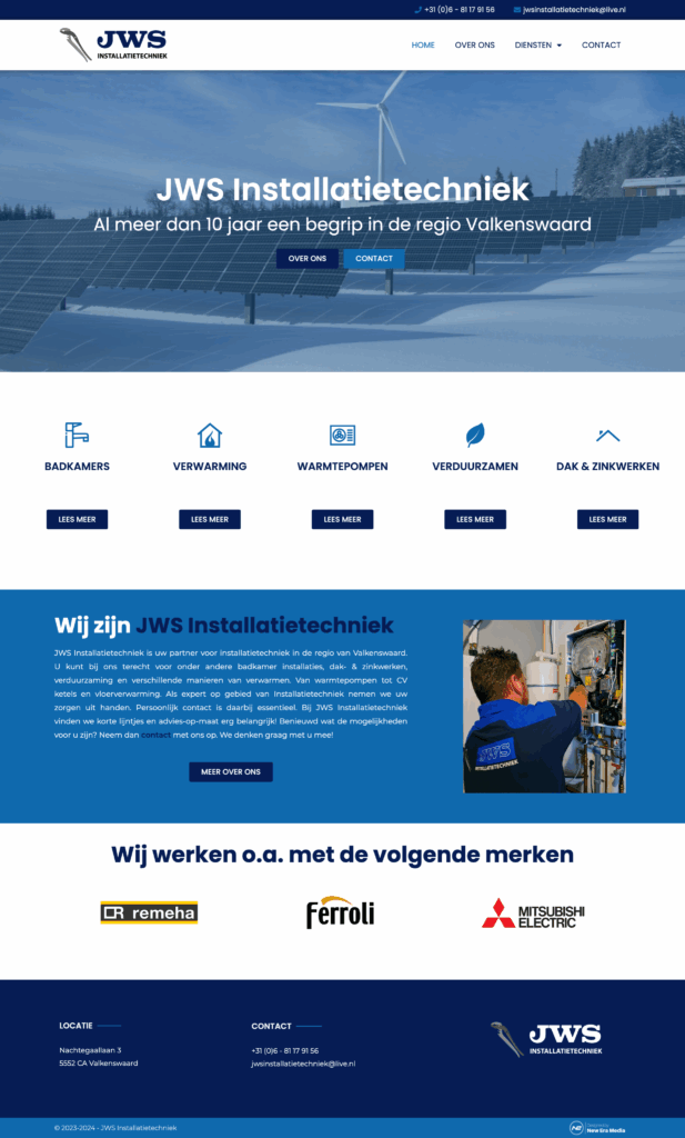 Voor JWS Installatietechniek werd een website ontwikkeld die aansloot bij de huisstijl van het bedrijf. New Era Media ondersteunde het bedrijf ook bij het schrijven van website teksten met een focus op lokale SEO.