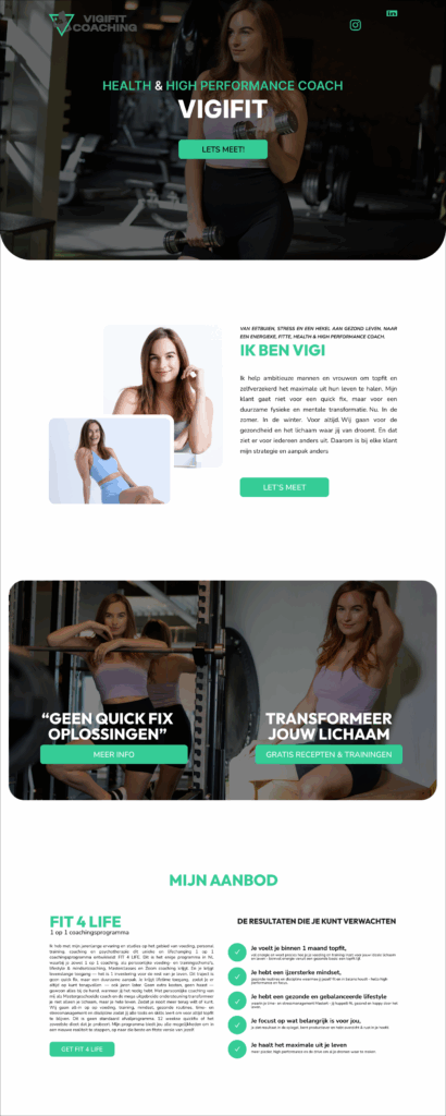 • Een one-page opzet: bezoekers kunnen snel hun weg vinden en in één oogopslag zien wat Vigifit coaching te bieden heeft.