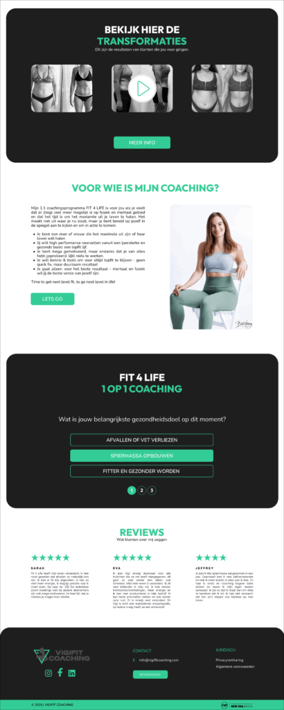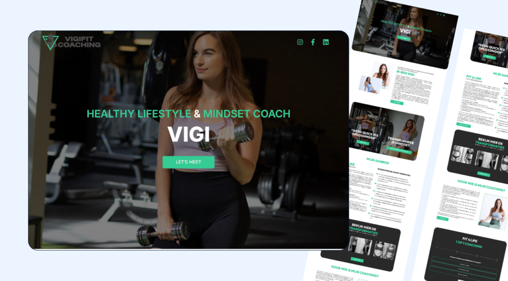 Een all-in-one ofwel one-page website voor Vigifit coaching bleek dé oplossing. Het doel? Een pakkende website met enkel de écht essentiële onderdelen, volledig gericht op maximale conversies. Ontworpen vanaf nul en naadloos afgestemd om de bestaande huisstijl, straalt de site professionaliteit, energie en vertrouwen uit.